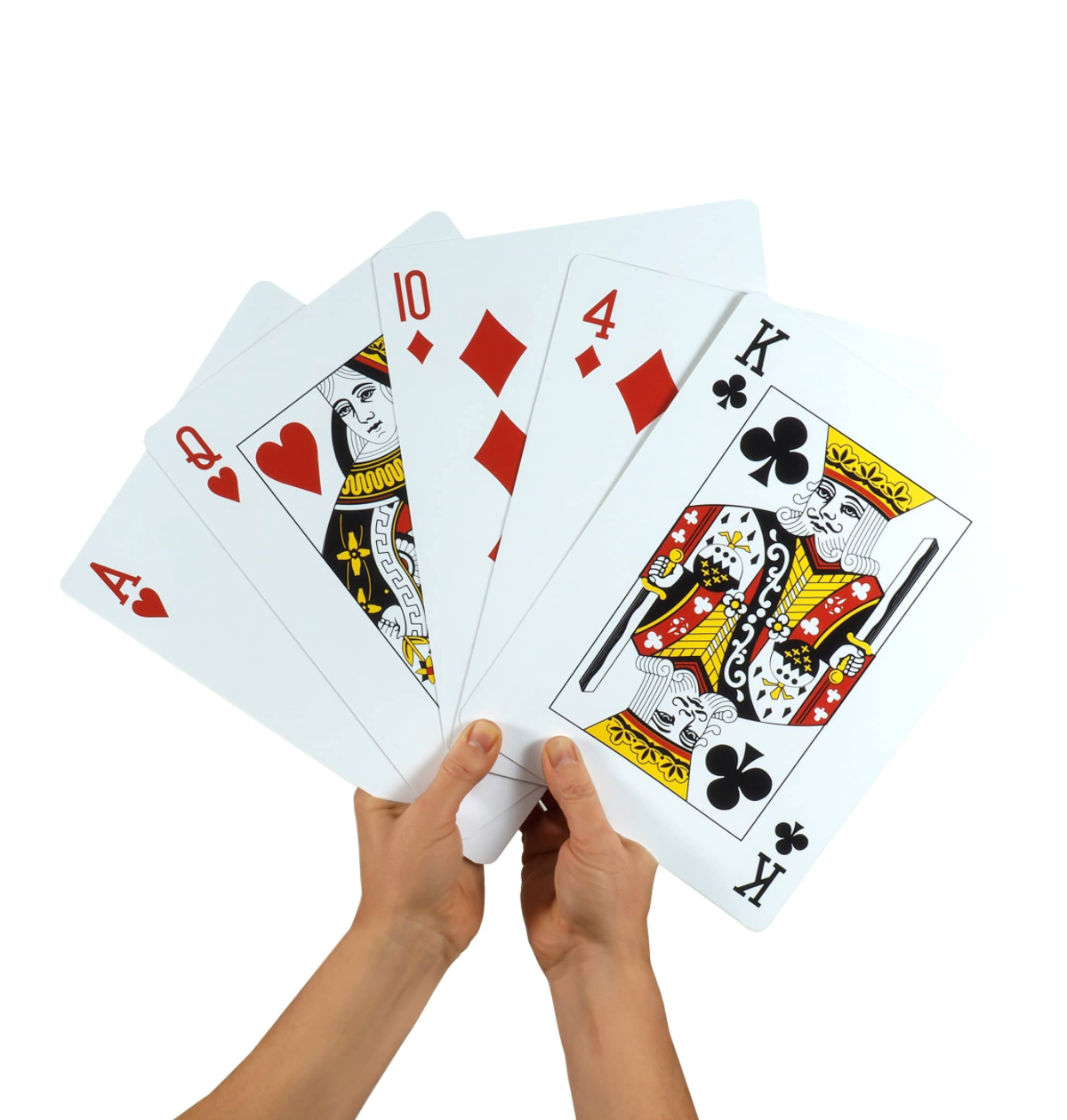 The BIG DEAL! Play all your favorite card games with this oversized deck of standard playing cards. Giant 8″ by 11″ size includes 52 cards plus 2 Jokers.