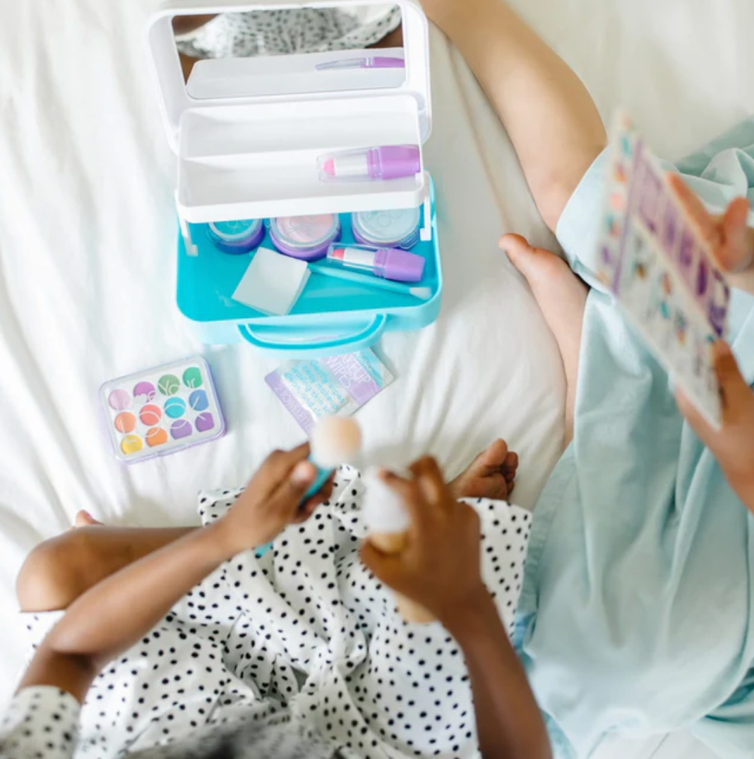 - Great for mess-free imaginative play: Realistic looking, but ITEMS DO NOT CONTAIN COSMETICS AND NO COLOR IS TRANSFERRED. Includes empty "foundation" pump bottle, compacts for pretend two-tone blush and powder, compact for pretend glitter, play lip gloss and 2 play lipsticks with removable caps, and a 12-color pretend eye shadow palette with snap-shut cover