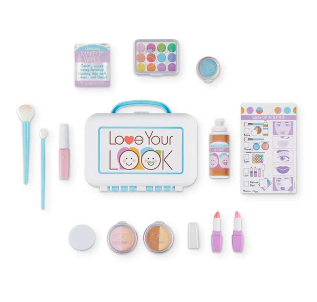 - 2 soft-bristled brushes (small for eyes, large for cheeks), 2 cloth makeup wipes in resealable pouch, reusable double-sided activity card; everything stores in durable, take-along makeup kit with built-in mirror