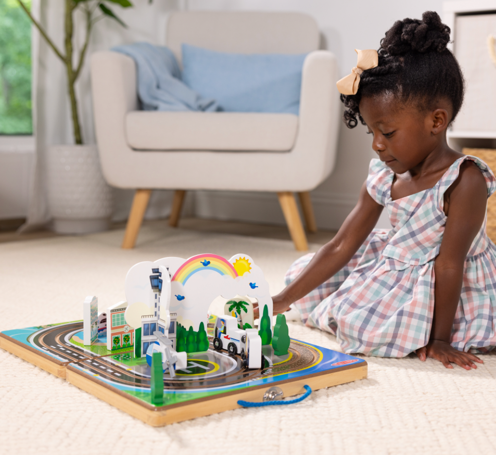 Let imaginations take flight! Unfold the sturdy wooden take-along case to create an illustrated play surface with built-in tracks for the three wooden wheeled vehicles (airplane, truck, and luggage cart) and the chunky wooden helicopter and cruise ship. Set up an airport and resort destination with wooden play pieces. Magnetic couplers let the truck pull the plane into the hanger or the luggage cart across the runway. All the pieces store in the fold-up case with convenient carrying handle for easy cleanup and travel (there’ s plenty of room to add other toys, too!). Keep playtime rolling for kids three and older and encourage independent play, communication, and motor skill development.
