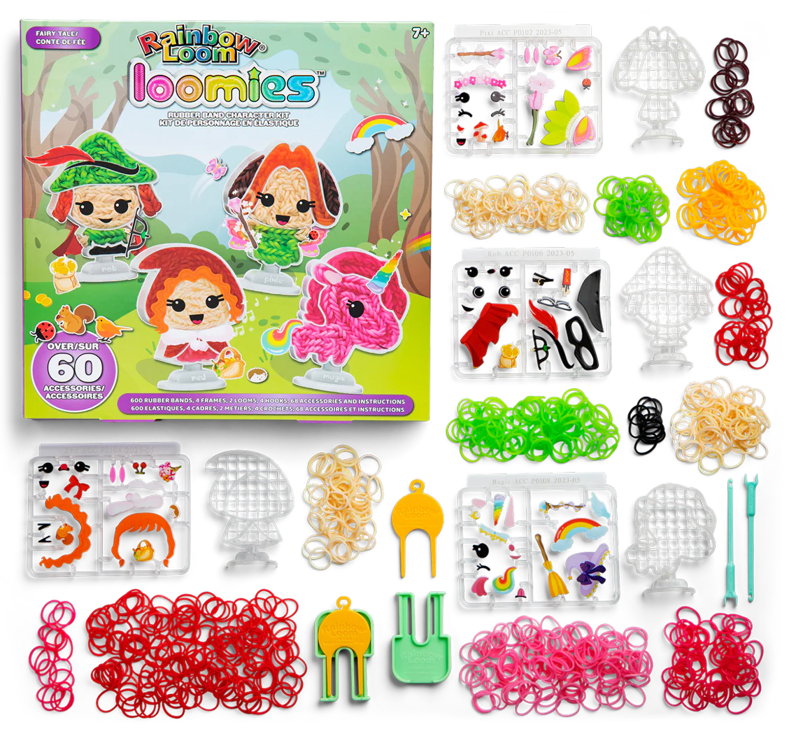 Introducing Loomies™! A new collection of adorable DIY Characters from Rainbow Loom™. With just a frame, rubber bands, and easy-to-use tools, you can create your own collectible Loomies™ figurine. Each Loomies™ figurine comes with interchangeable themed accessories allowing you to make a variety of characters. Great for any age, just create, play, and display!