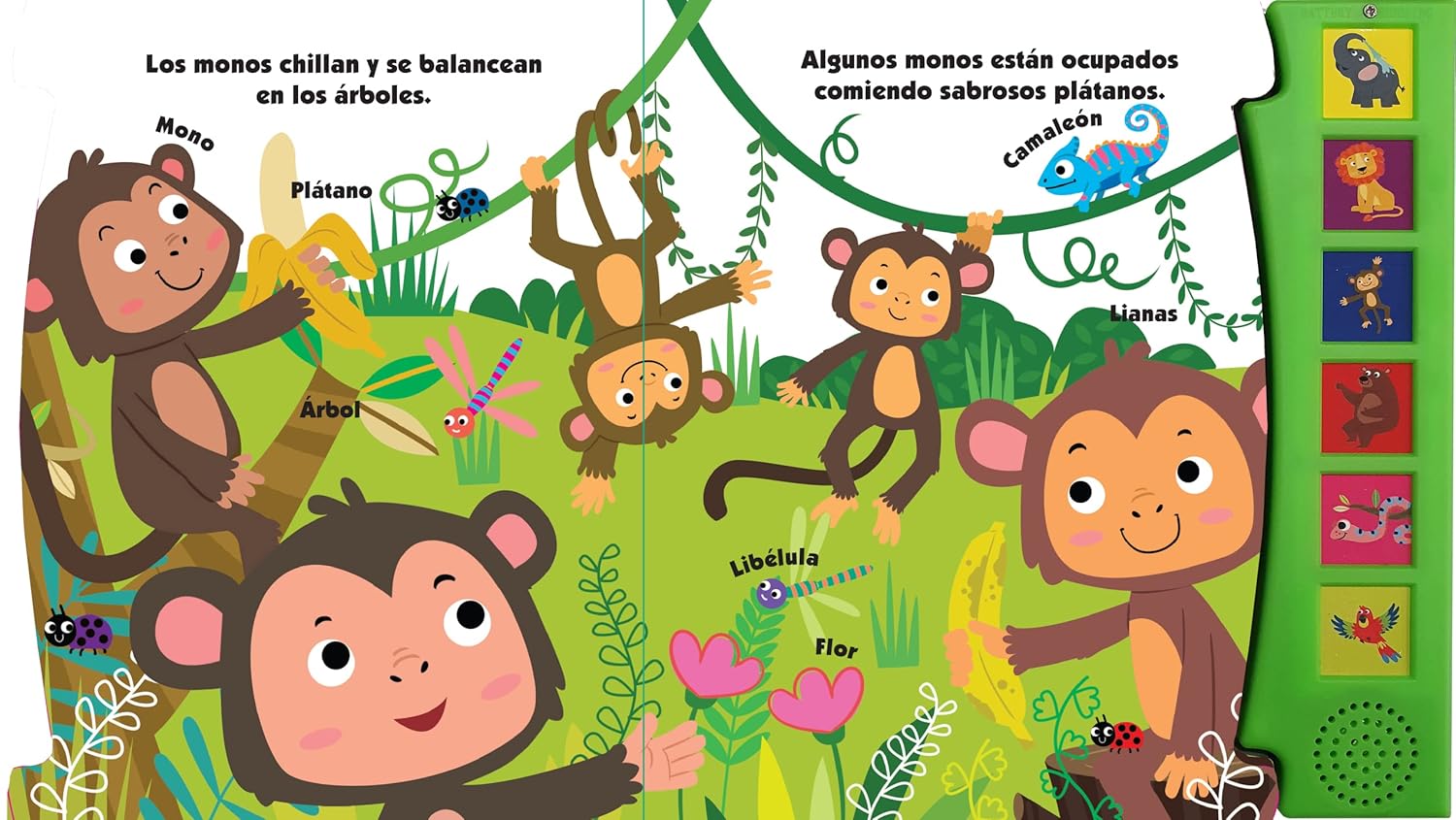 En este entrañable libro encontrarás un panel de sonidos de la selva. Pulsa el botón para escuchar los sonidos de los animales de la selva y muchos sonidos más. Los más pequeños disfrutarán de las encantadoras aventuras de estos animales ruidosos.
