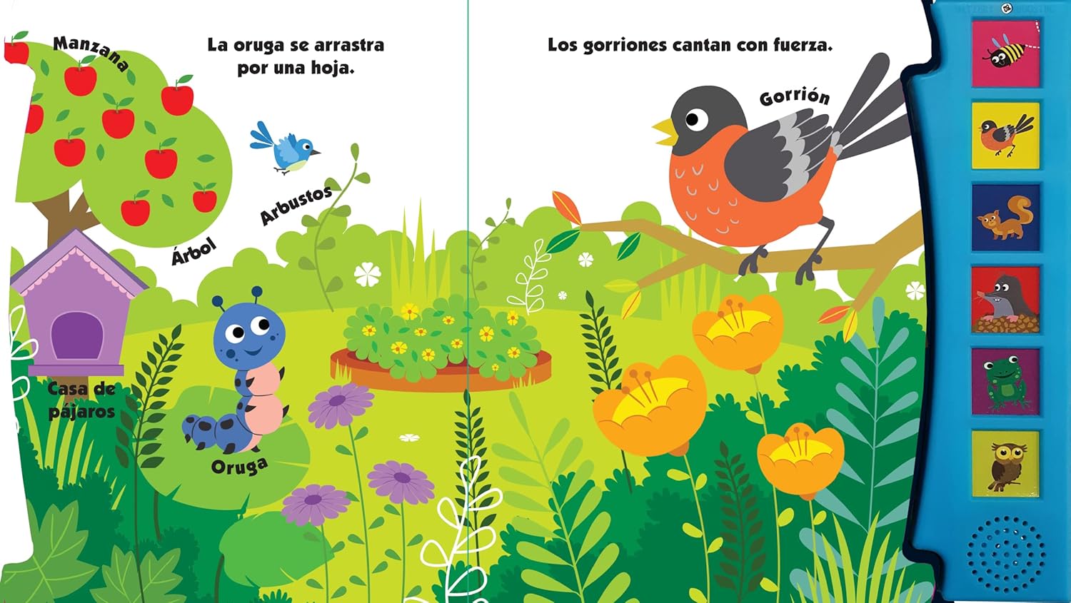 En este entrañable libro encontrarás un panel de sonidos del jardín. Pulsa el botón para escuchar los sonidos de los animales del jardín y muchos sonidos más. Los más pequeños disfrutarán de las encantadoras aventuras de estos animales ruidosos.