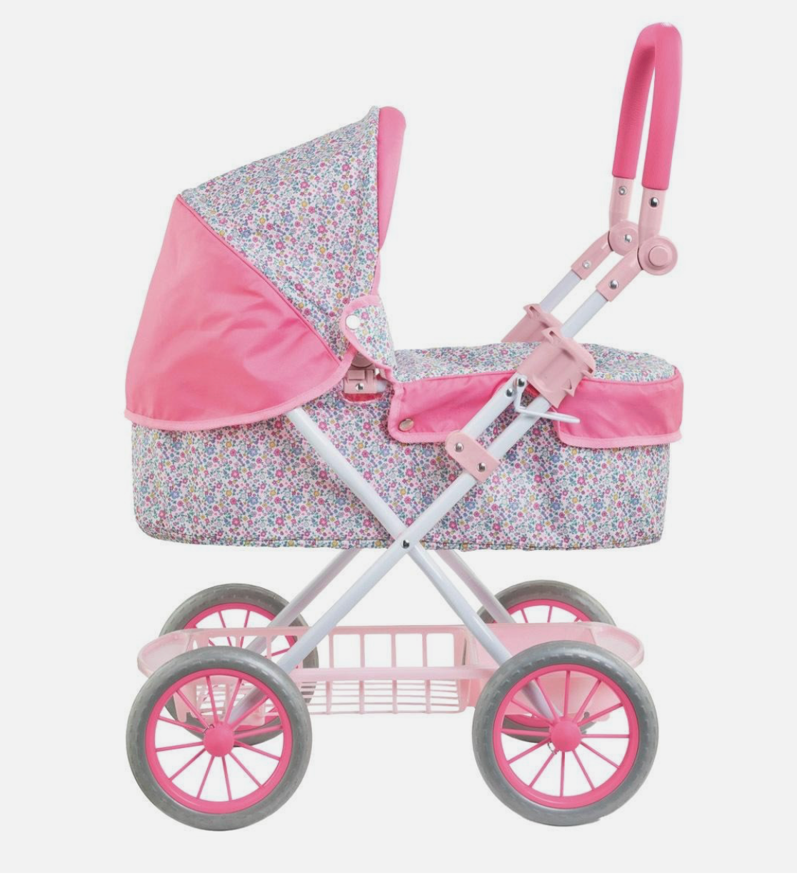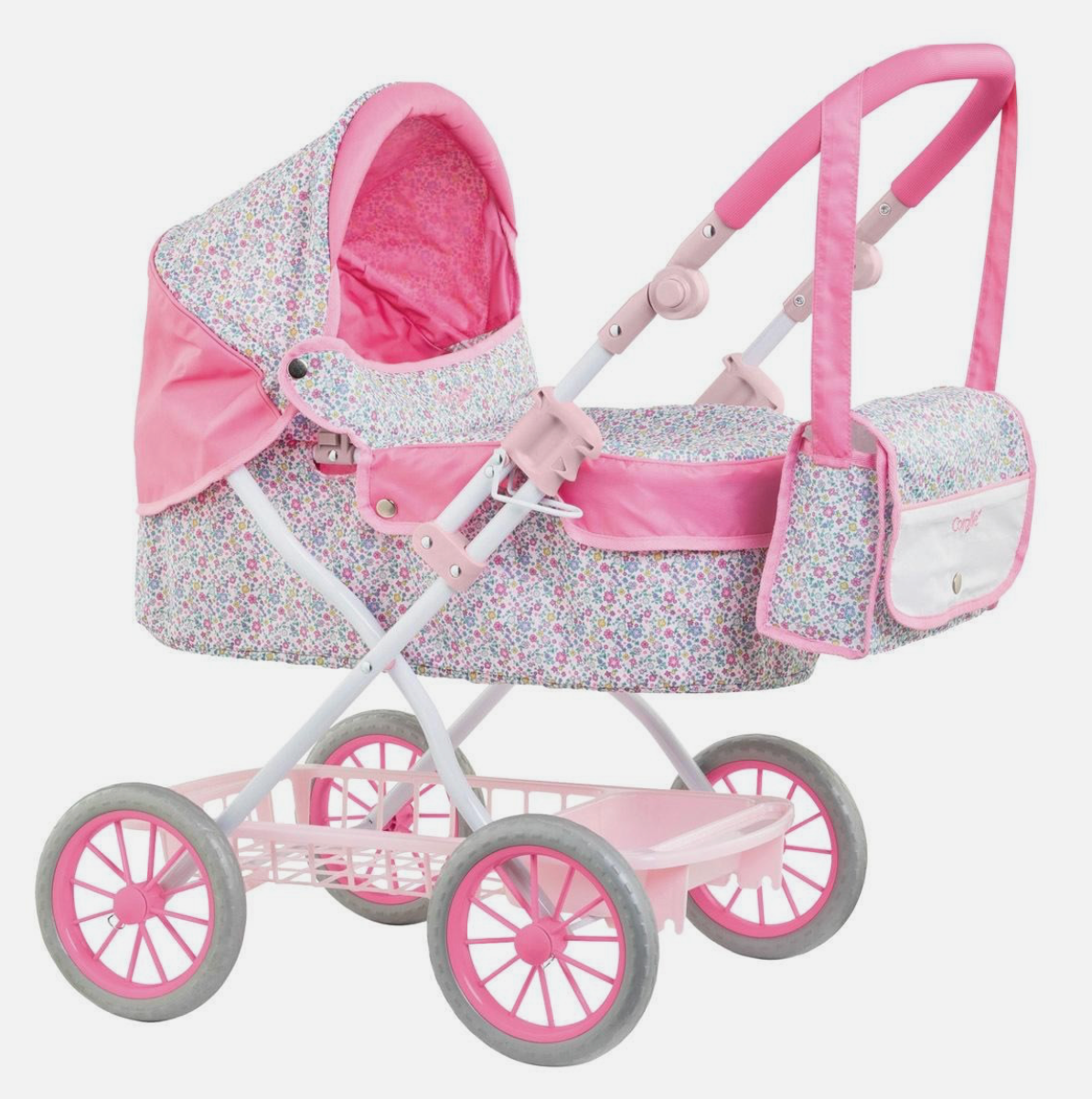 It's time for a walk and make-believe moms and dads will love taking their favorite 14" - 20" baby doll for a stroll in style. Its handle height is adjustable from 14" to 29.5" to accommodate children as they grow. It has an adjustable hood, a storage basket for baby's things, a removable bassinet cover and comes complete with a matching nursery bag. When playtime is over, the carriage folds easily for space-efficient storage. It's part of the Mon Grand Poupon Corolle Collection of dolls, fashions and accessories to help little ones take care of their baby doll the way their parents take care of them.