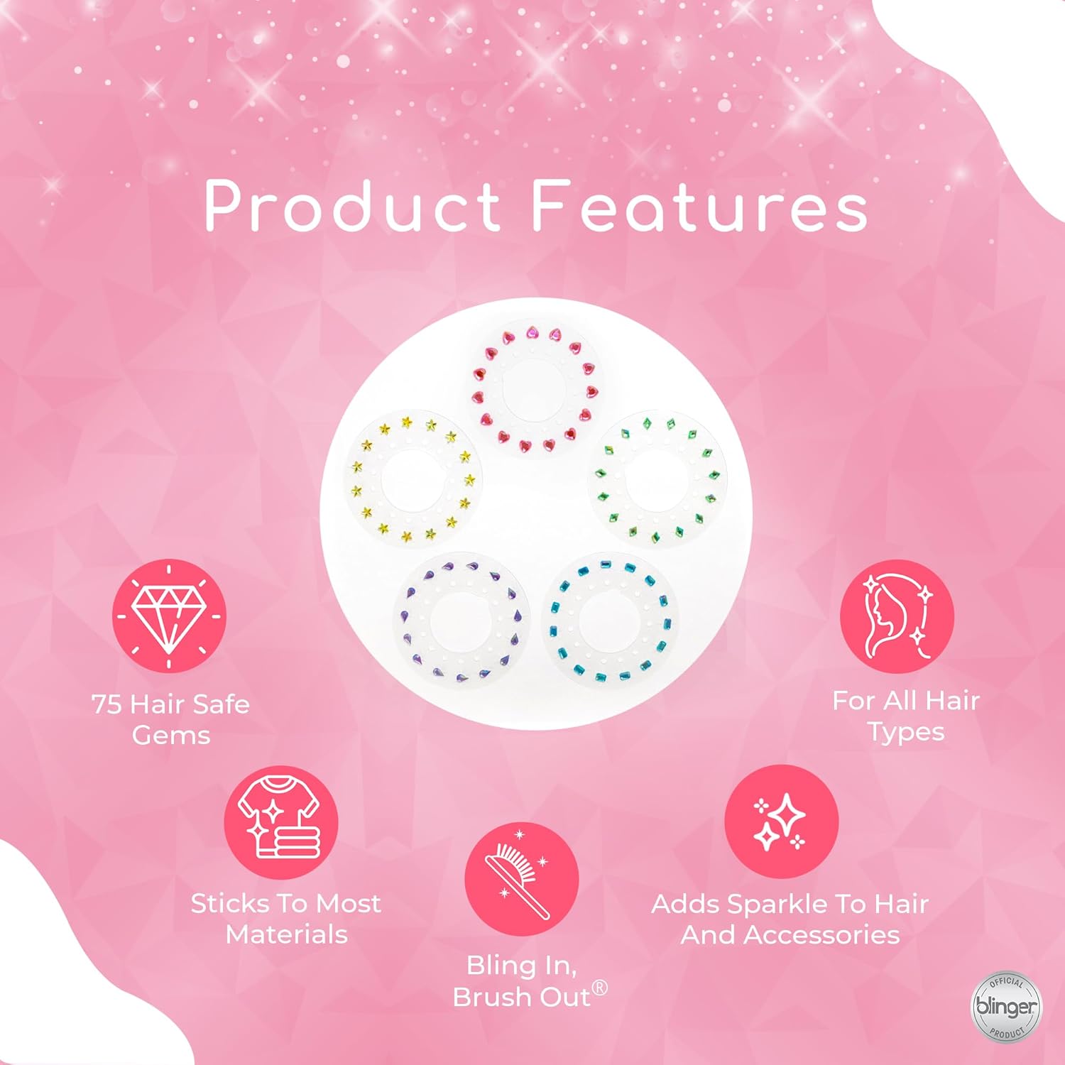 - Whether you're blinging your hair, fashions or accessories, these gems stay on all day until you easily brush them out or peel them off! Hair-safe adhesive.