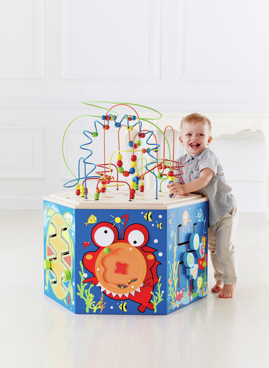 Levels, dials, gears, games, and mazes create an ocean of fun on this six-sided activity table. A mirror reflects kids' smiles.