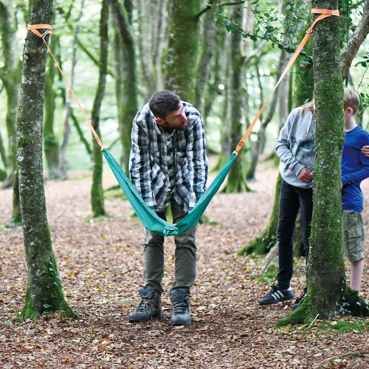 Relax when you're out in nature with this fun portable swing set! Once set up between two strong trees, It provides a fun swing or a place for children to sit.