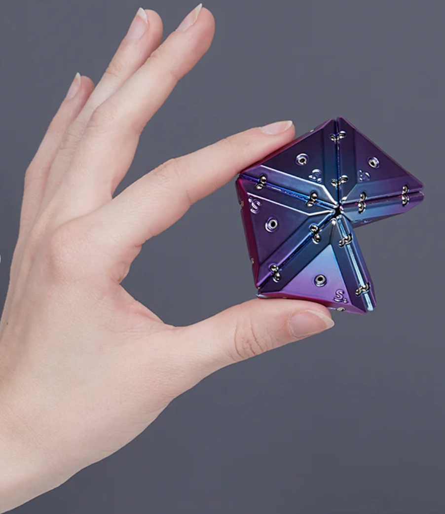 On-the-desk or on-the-go, Geode is the perfect fidget desk toy. Each set includes 12 pentagons or triangles that align and snap into the perfect sphere. Combine colors and shapes for bigger builds and more fun!
