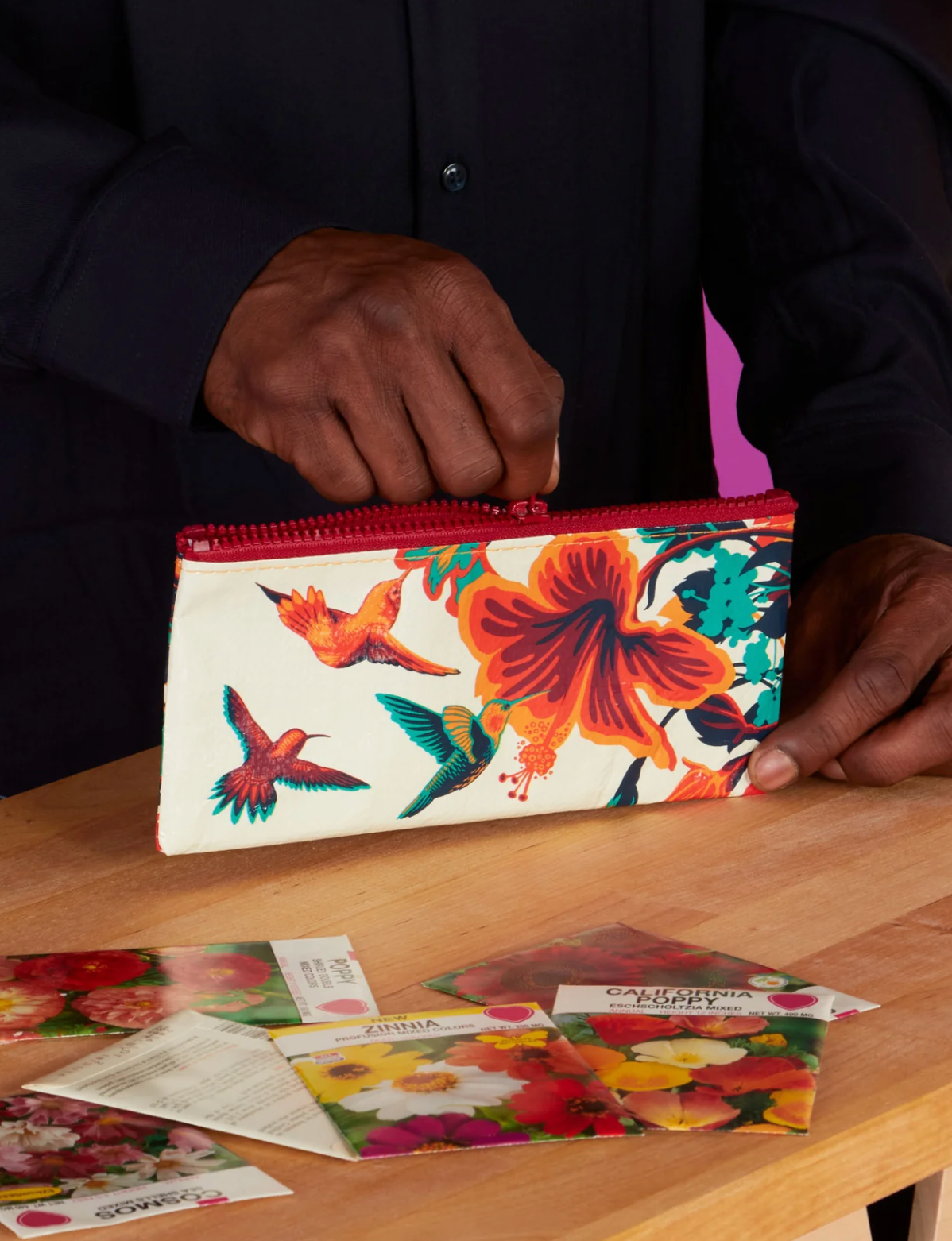 Did you know that hummingbirds are attracted to bright colors and stylish bags? It's true!