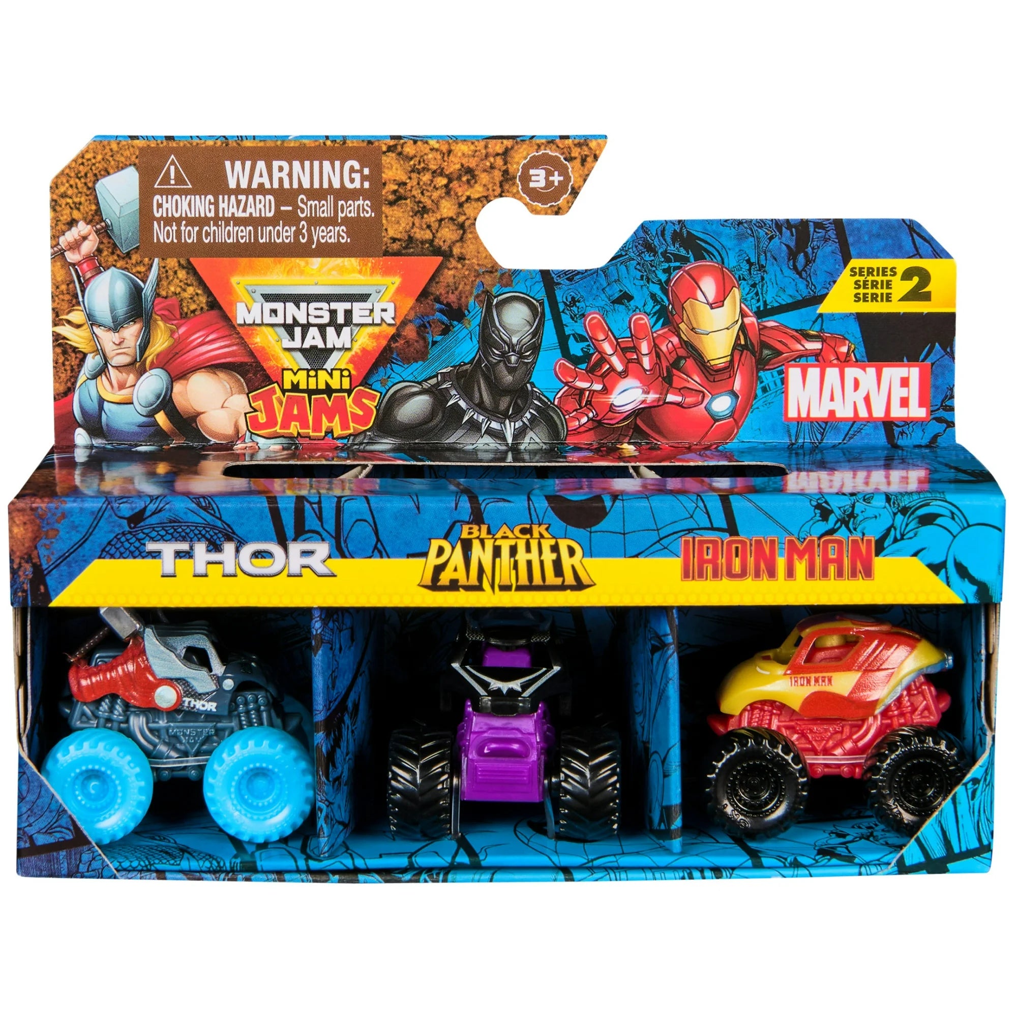 - Collectible Heroes: Collect all the Mini Marvel Monster Jam trucks! There's Black Panther, Iron Man, Thor, Captain America, and War Machine!