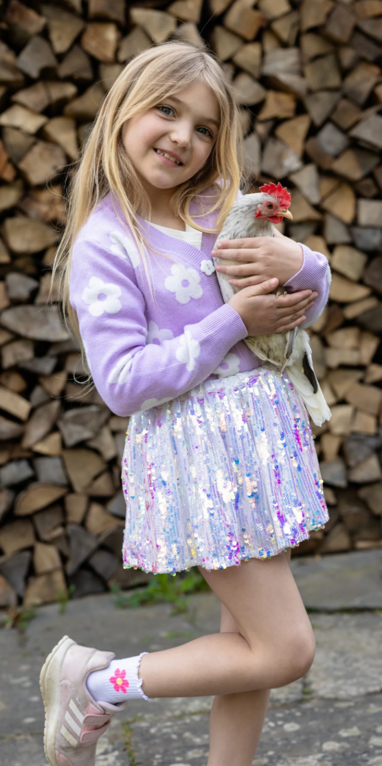 Shine like you're center stage in the Sequins Concert Queen Skirt – a dazzling, dance worthy piece inspired by pop royalty herself! This sparkling skirt features a stunning mix of large and small iridescent sequins that appear white at first glance, but reflect soft shades of purple and rainbow shimmer as they catch the light – just like the magic of a concert spotlight!